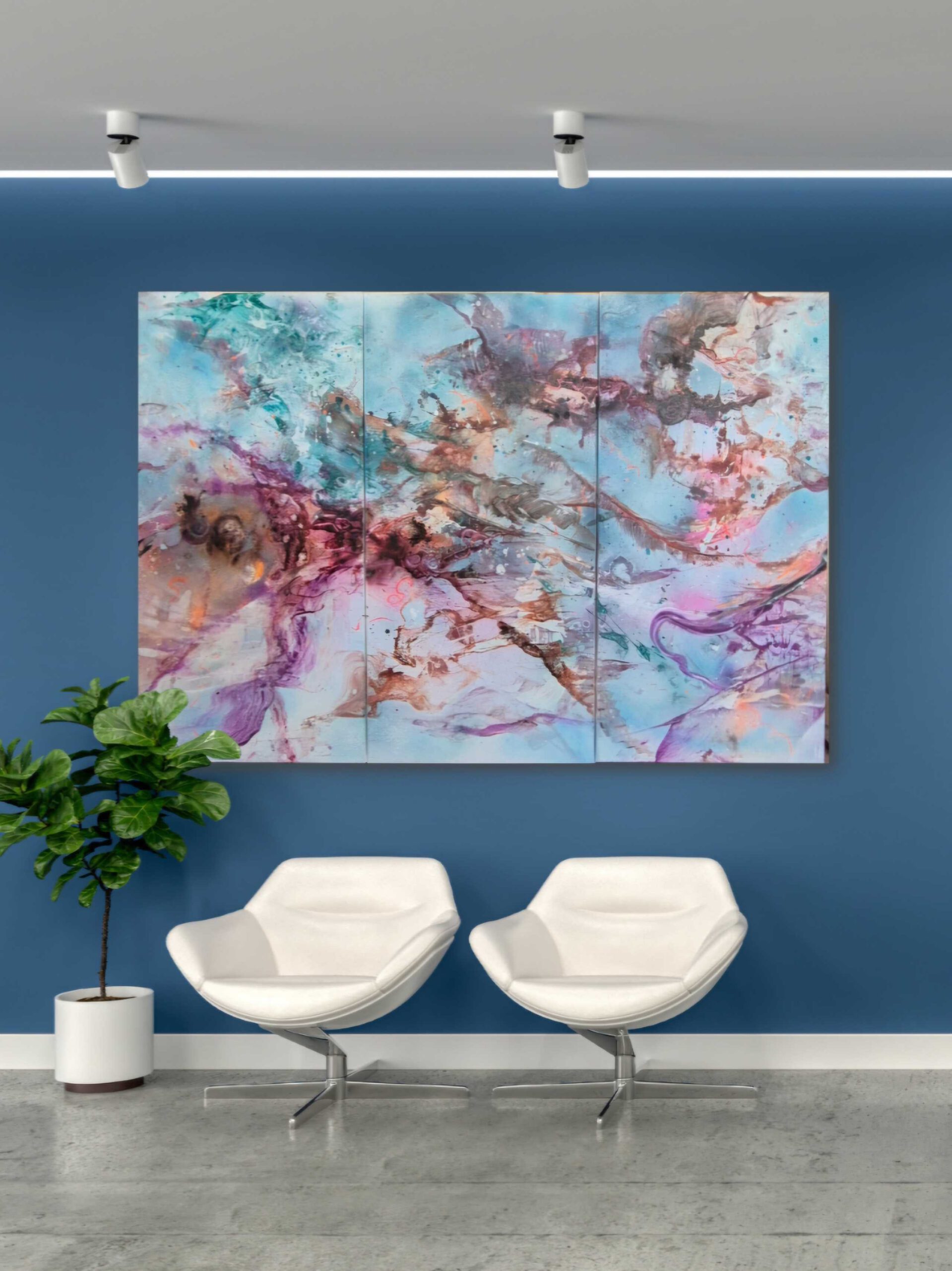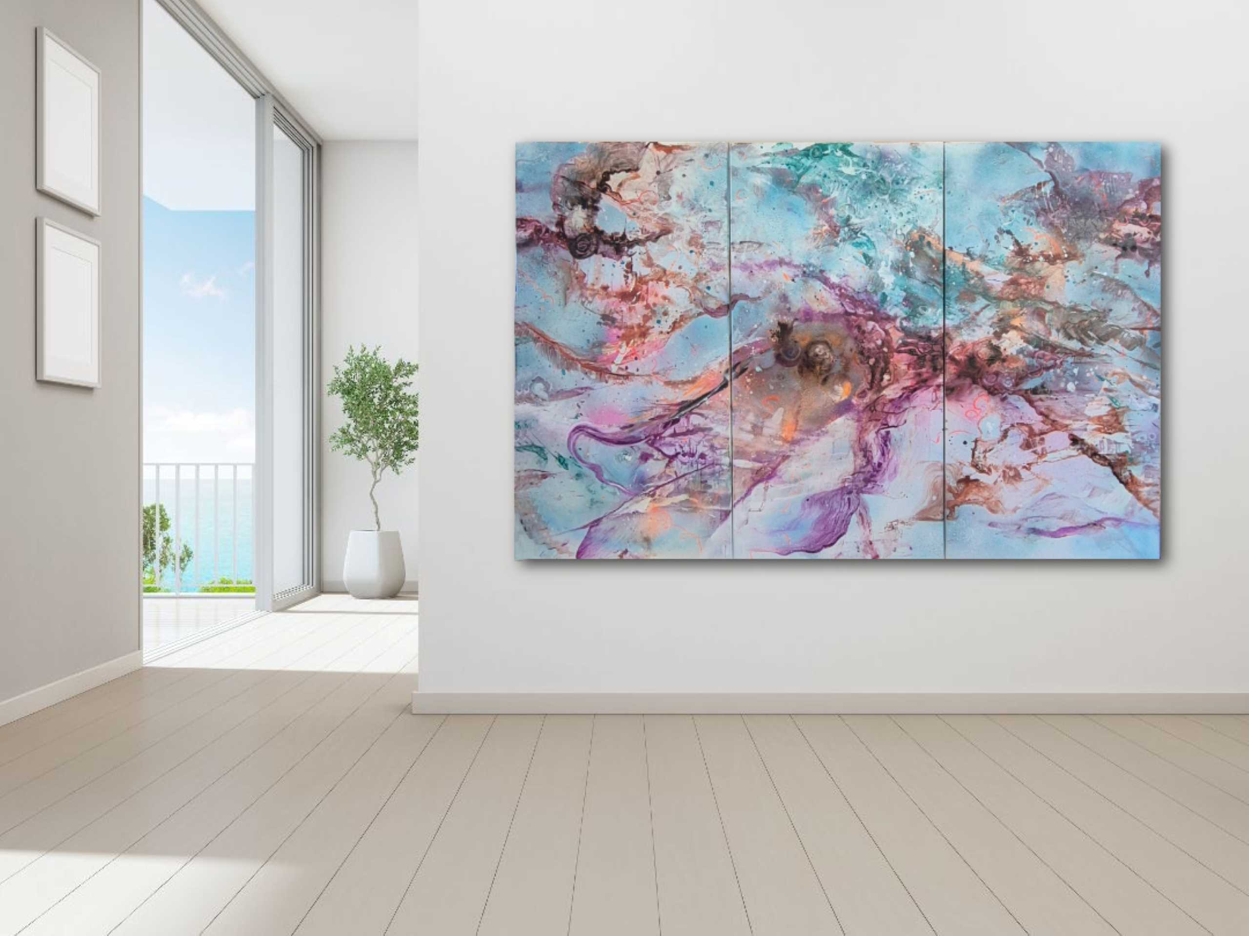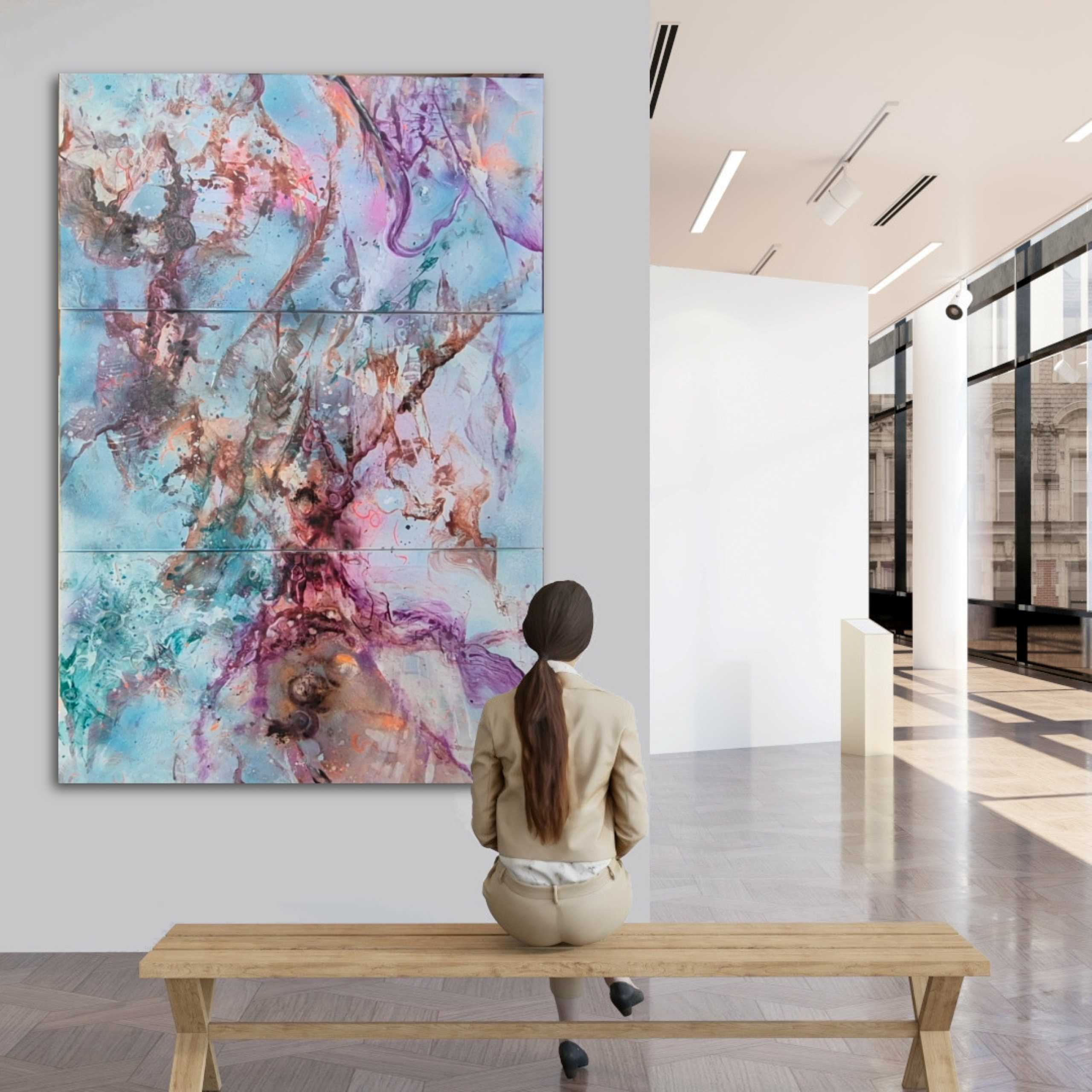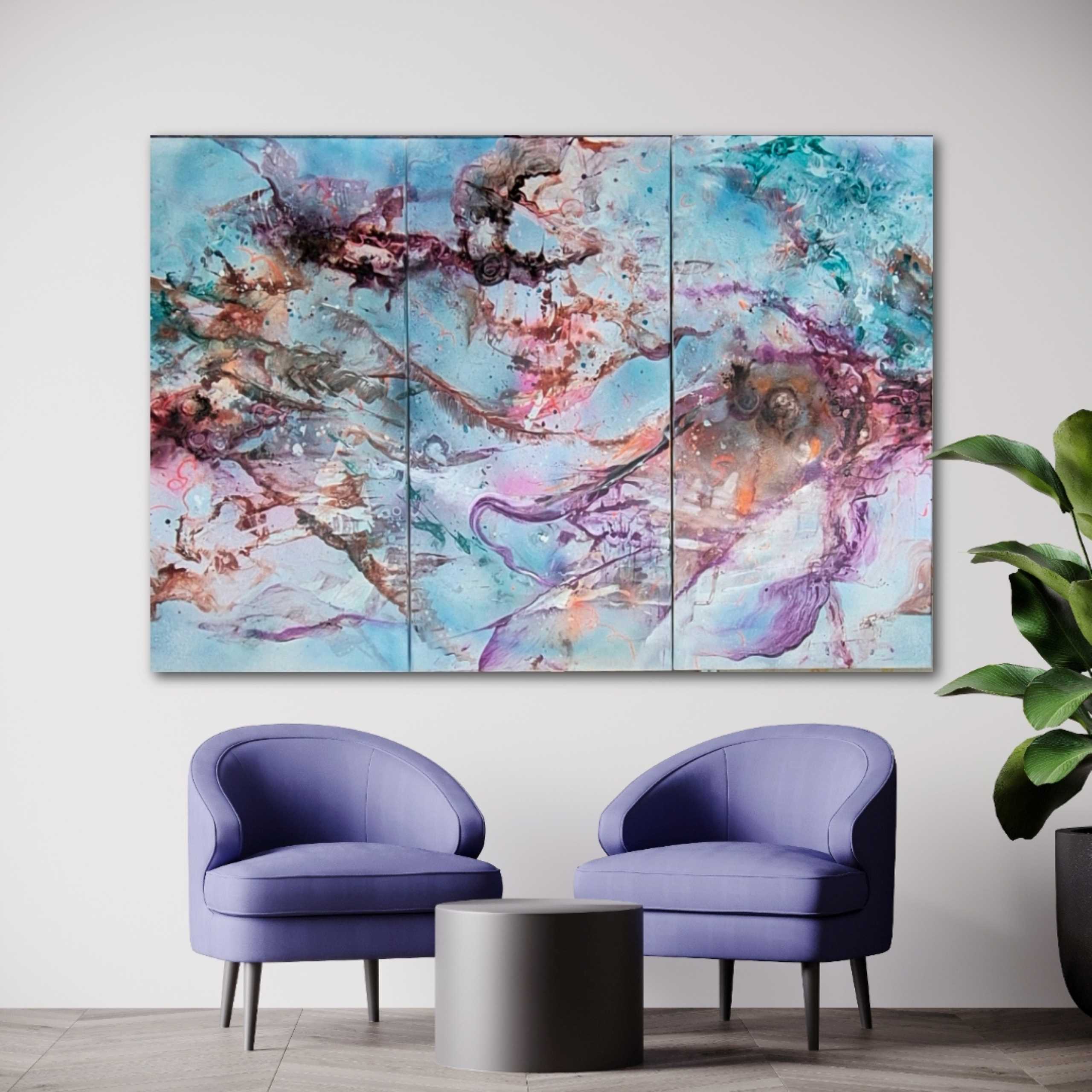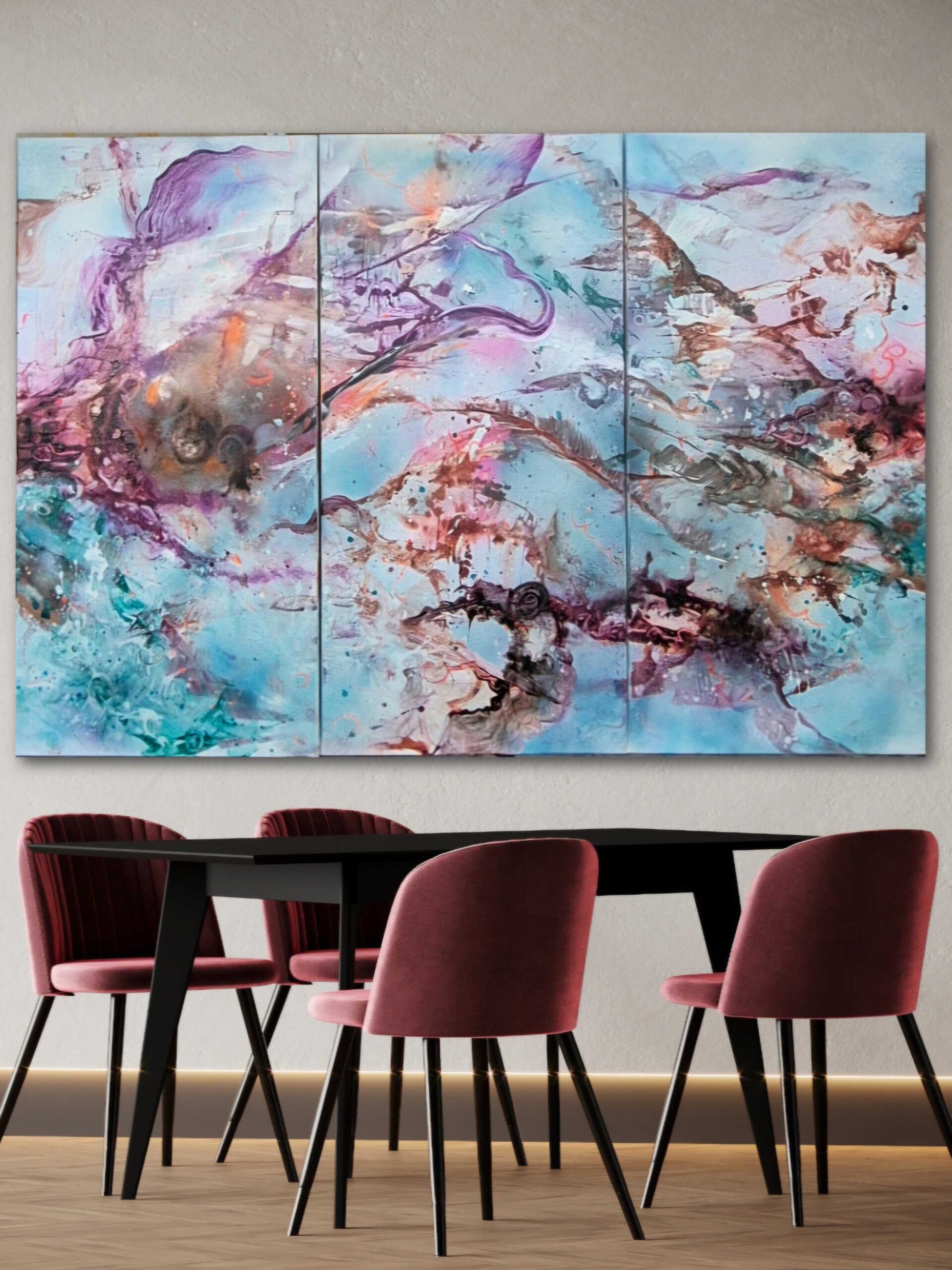Dieses Triptychon lädt zum Träumen ein. Sanfte Farbtöne in Blau, Türkis und Violett verbinden sich in einer dynamischen Formsprache, die Leichtigkeit, Freiheit und Fantasie spüren lässt – wie Träumende, die ihre Flügel ausbreiten und die Welt aus der Vogelperspektive betrachten.